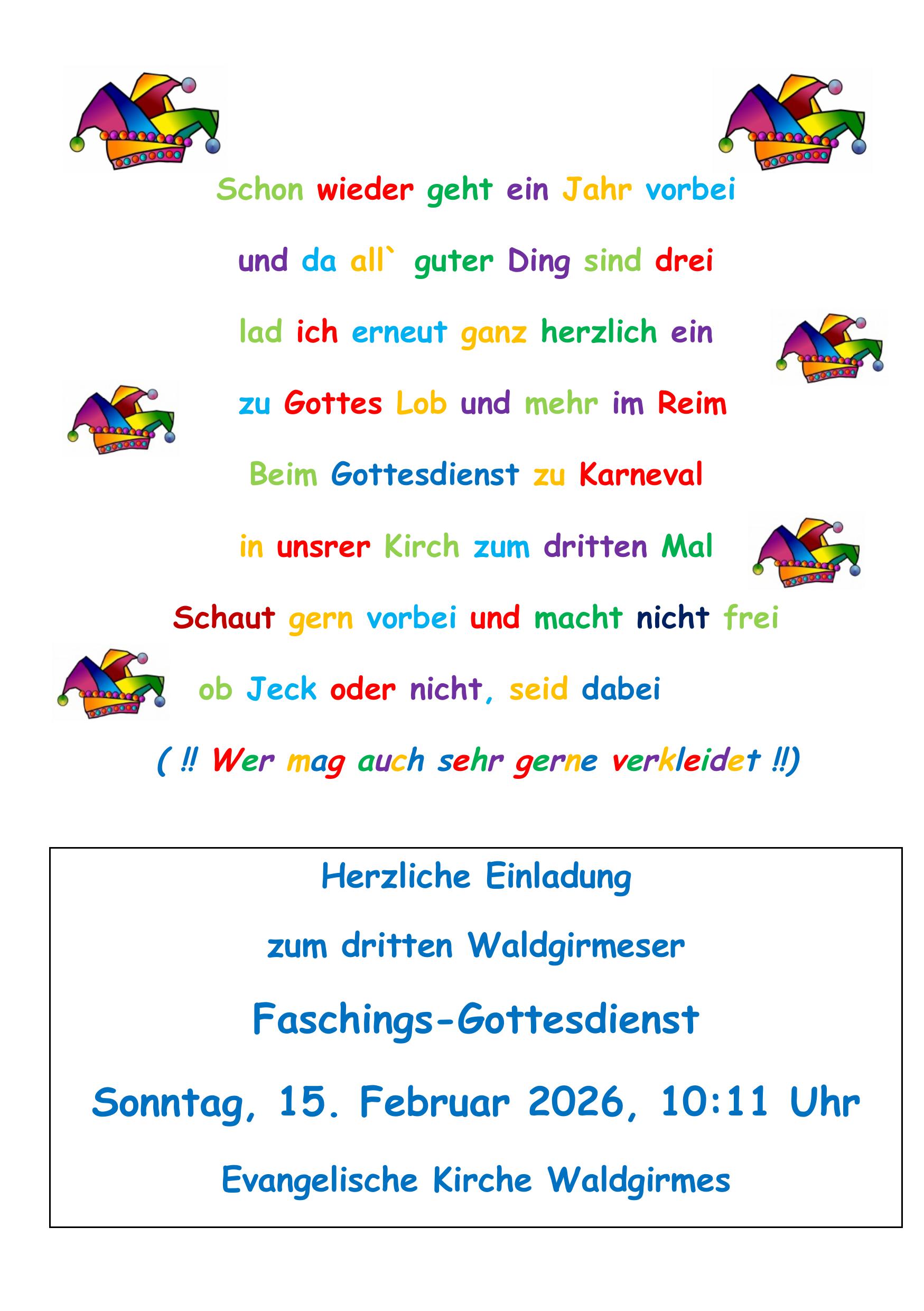 10:11 Uhr – Faschings-Gottesdienst mit Pfarrer Daniel Cremers, anschließend Kirchenkaffee