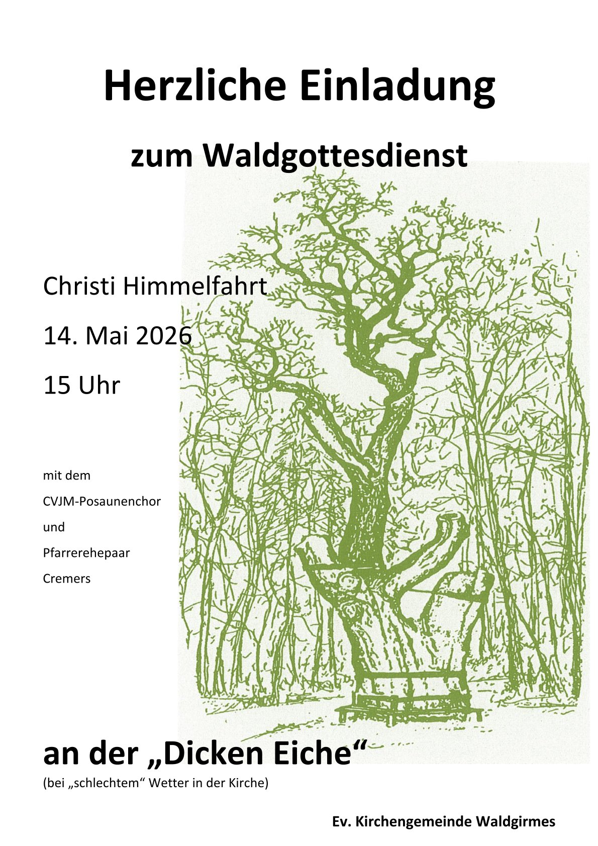 15 Uhr – Open-Air Gottesdienst zu Himmelfahrt an der Dicken Eiche mit Pfarrerehepaar Cremers, musikalisch begleitet durch den CVJM-Posaunenchor (bei Regen in der Kirche)